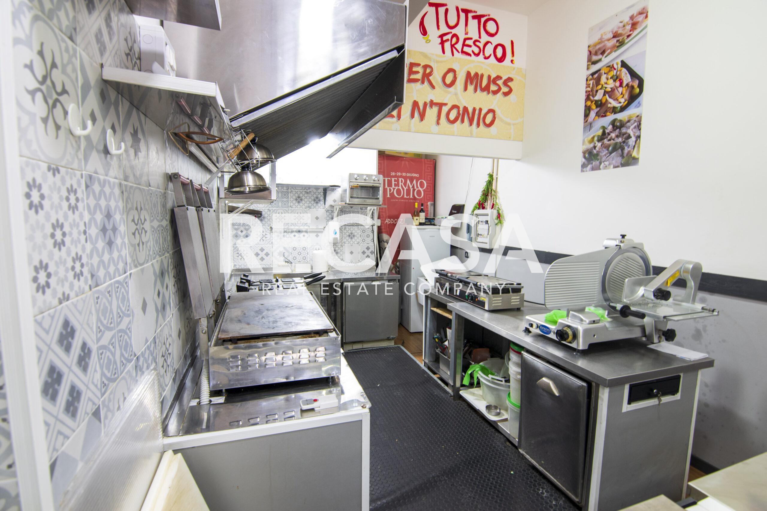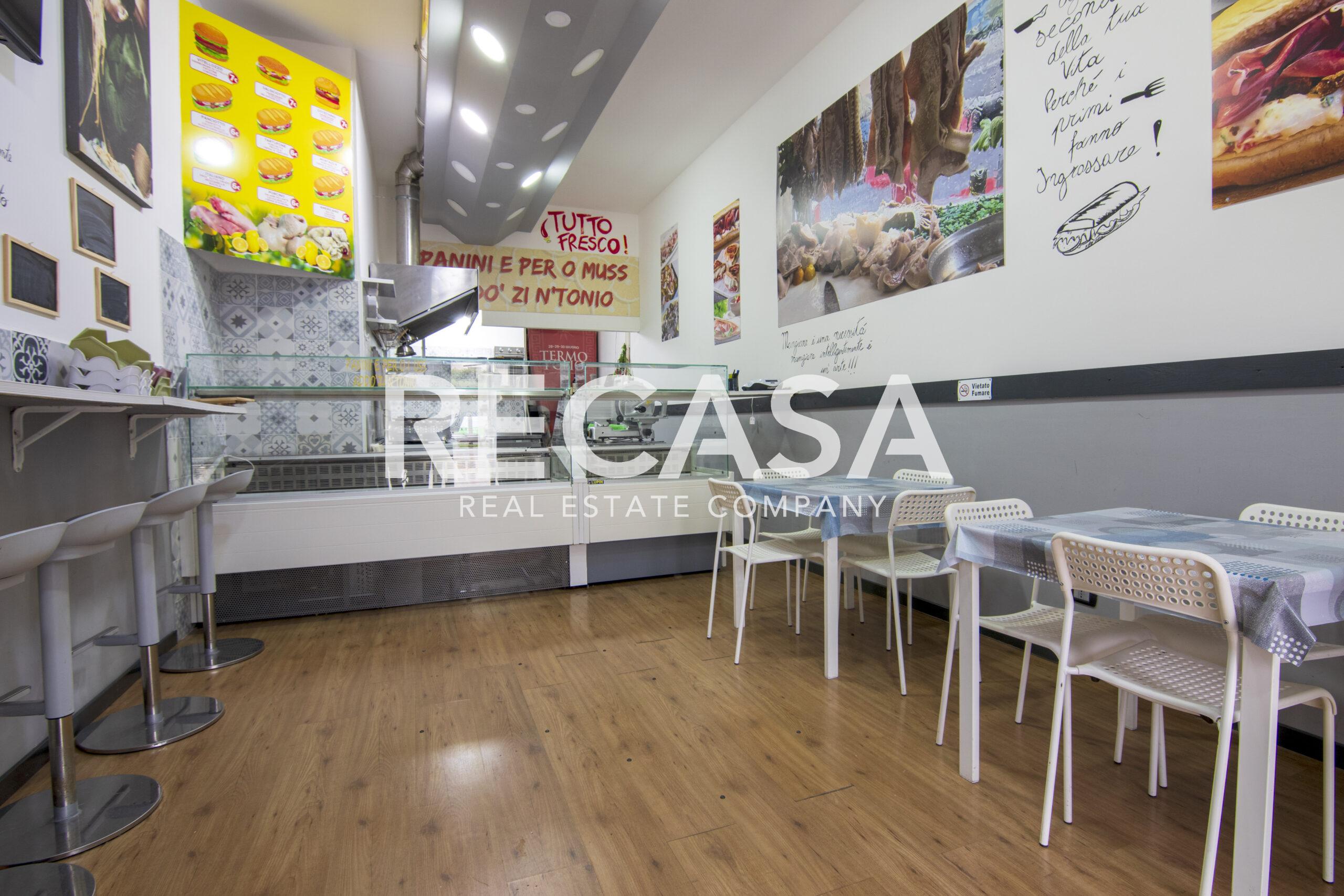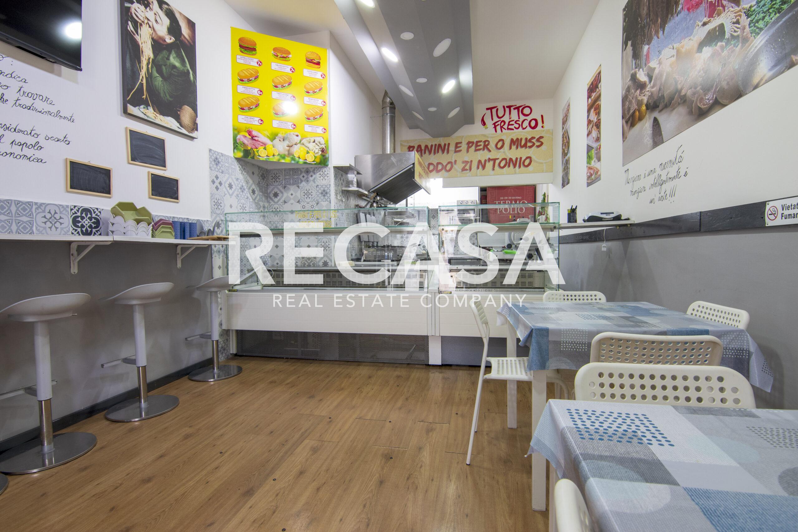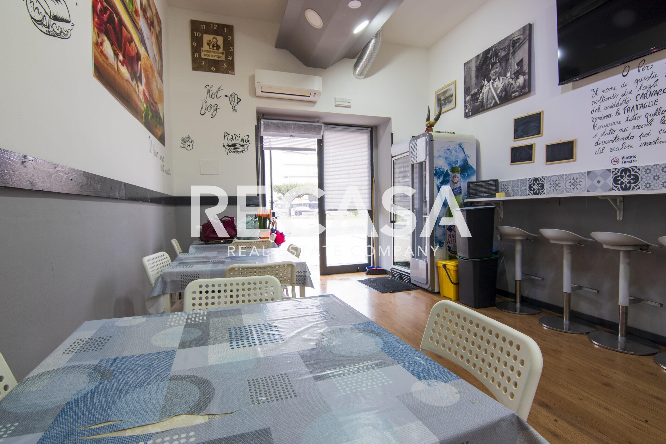 Al piano terra, ambiente unico di 40 mq con comodi posti a sedere, bancone e cucina, al piano seminterrato del locale, raggiungibile con scala interna, comodo deposito di 40 mq e wc.